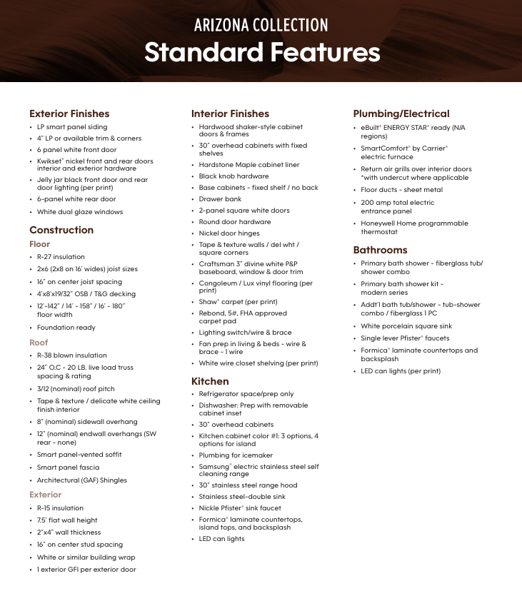 Arizona Collection homes are built with quality, comfort, and value in mind. These homes feature durable exterior materials, energy-efficient construction, stylish shaker-style cabinetry, modern lighting, and functional kitchen and bathroom finishes—all included as standard. With thoughtful design and dependable craftsmanship throughout, the Arizona Collection offers affordable homes with upgrades available.